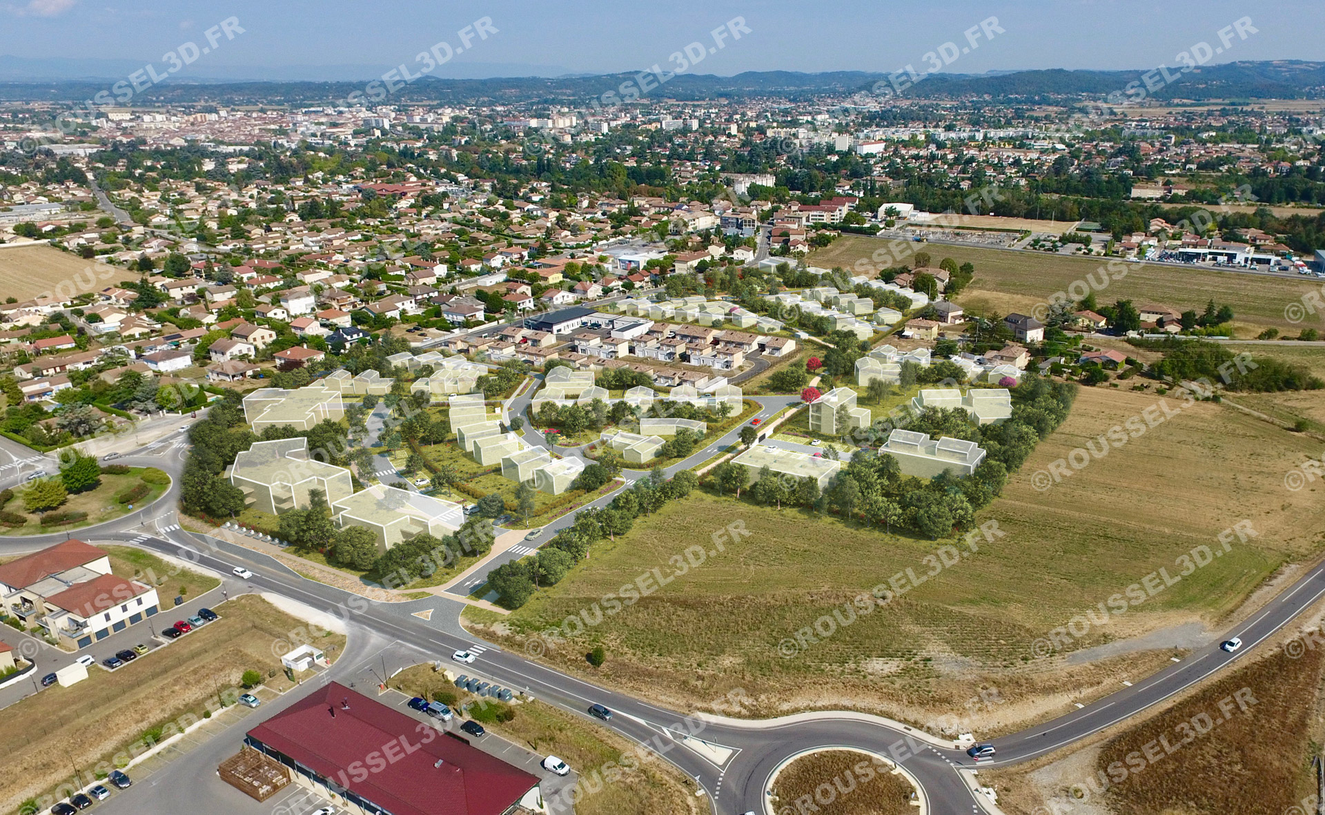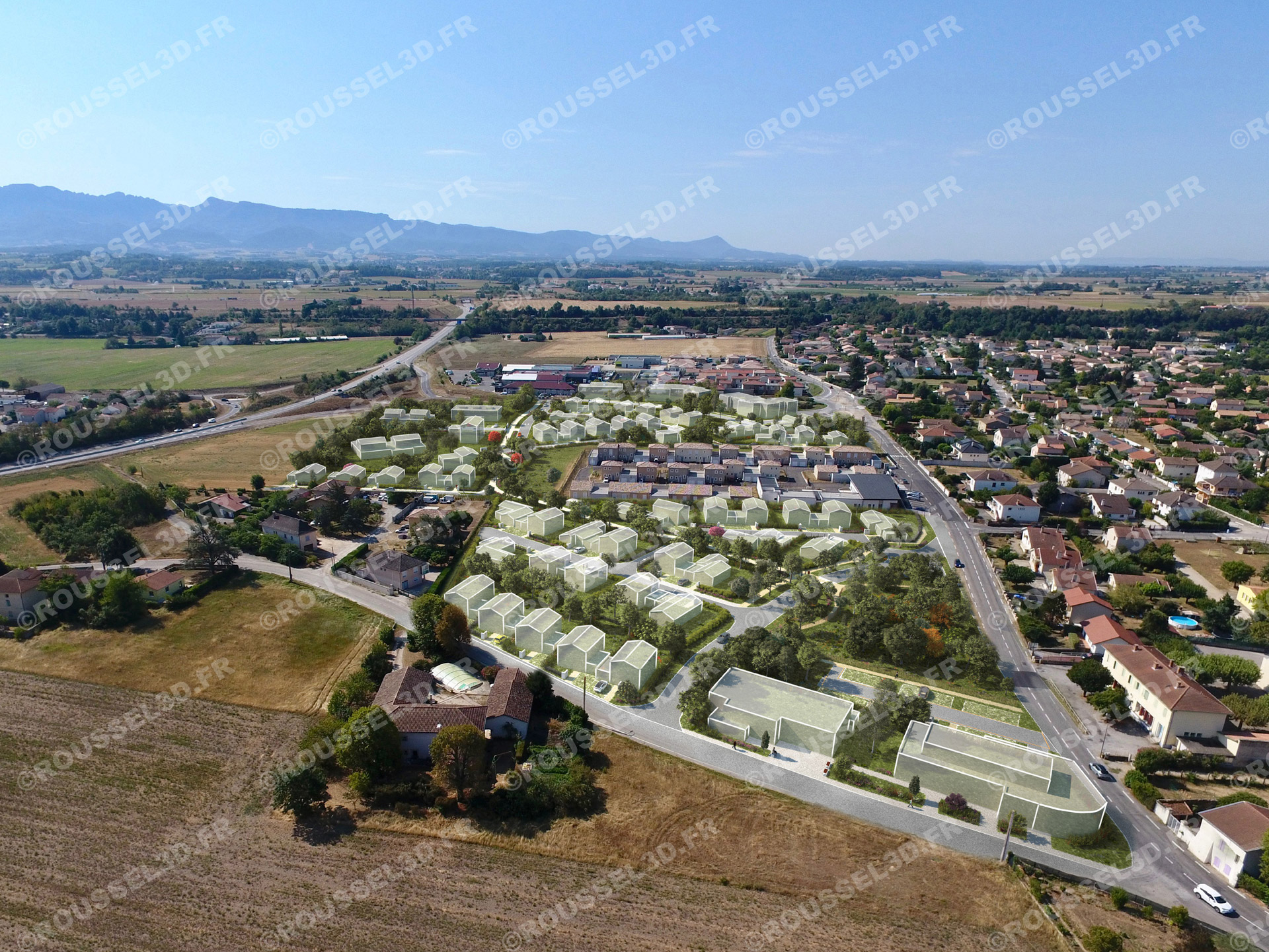 Projet situé à Rochefort-Samson (Drôme) : perspective aérienne insérée dans une photo drône. Une belle insertion sur site avec le Vercors en arrière-plan.