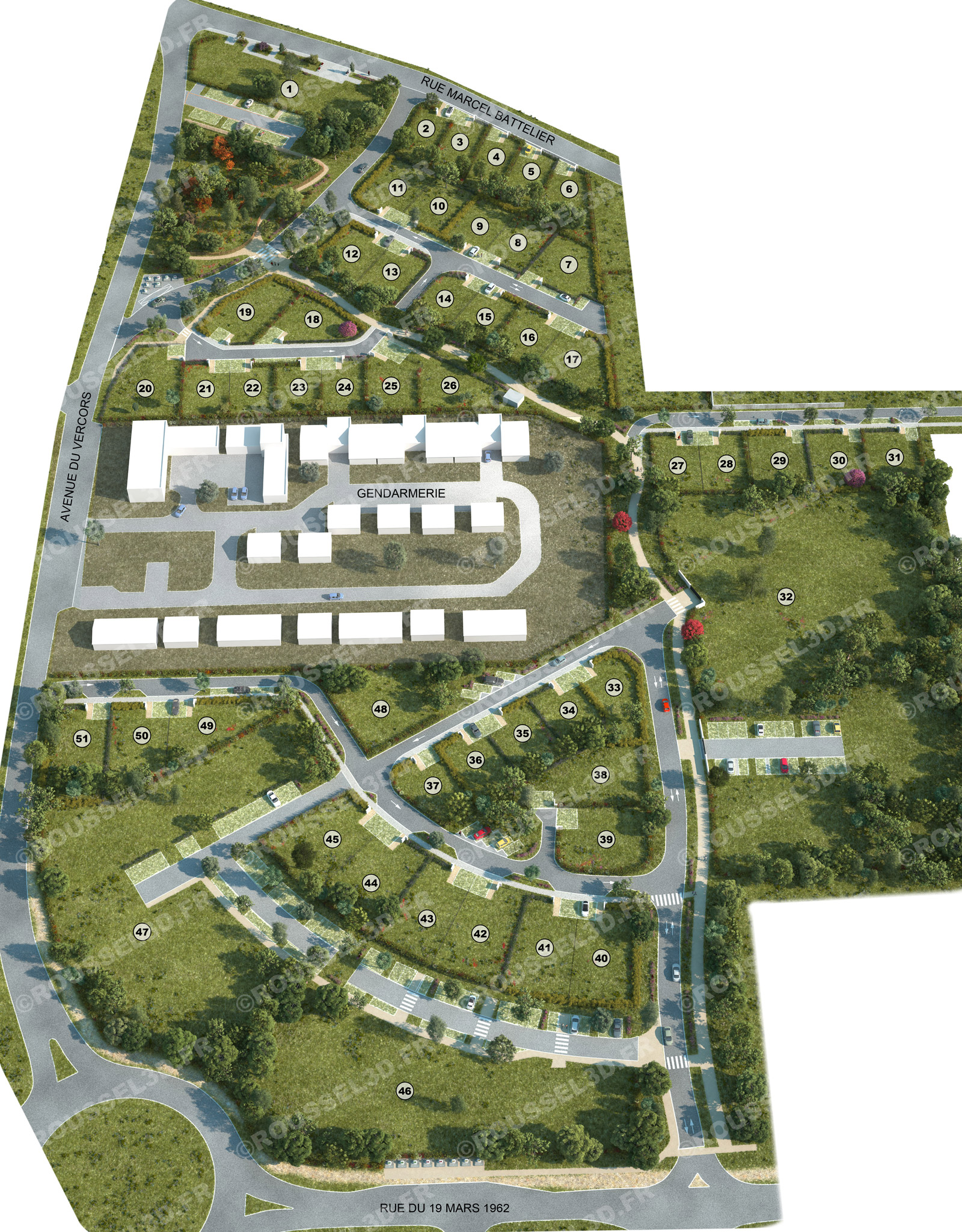Voirie, entrées de lots, blocs techniques, candélabres, parcelles délimitées et paysagées selon vos souhaits...
